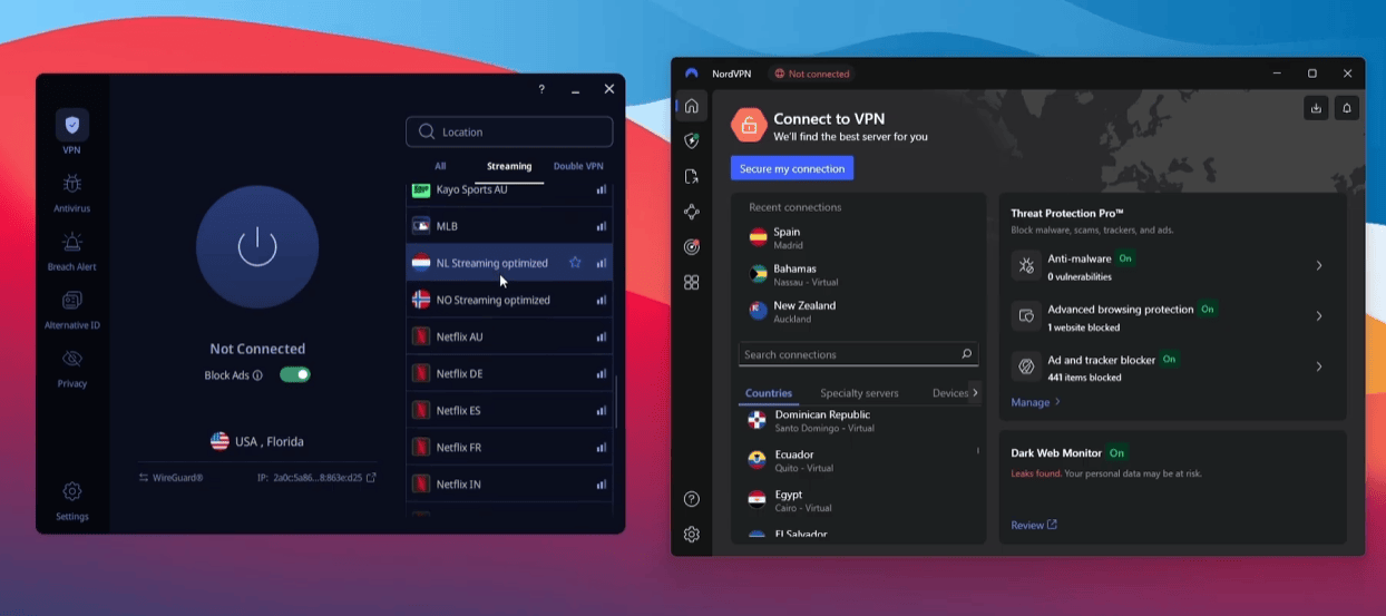 Both services include split tunneling. This is useful if you want certain apps to use the VPN while others connect normally—for example, routing streaming apps through the VPN while leaving banking or local services on your regular connection.